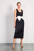 Платье полуприлегающего силуэта, выполнено из трикотажного полотна, с оригинальным принтом. Спинка платья со средним швом, в котором обработана застежка на потайную тесьму-молнию. В боковых швах обработаны карманы. Перед с нагрудными выточками. Рукав длинный, втачной. Воротник-стойка. Изделие без подкладки.