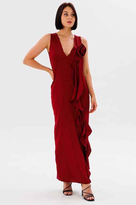 Платье в длине миди, выполнено из шелка армани, лиф отрезной, по переду сбоку обработан вырез с воланом. Застежка - потаная молния в боковом шве. Декор в виде цветка с воланами отстегивается.