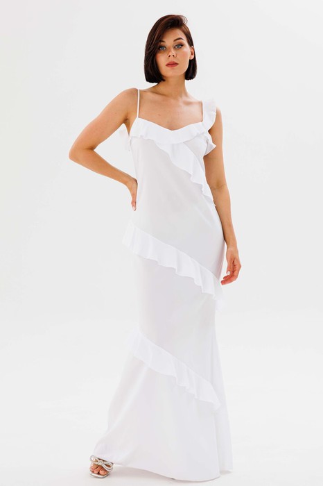 Платье выполнено из шелка армани, по платью обработаны воланы, одна бретель тонкая, другая обрабоатна воланом. Застежка - потайная молния по центральному шву спинки