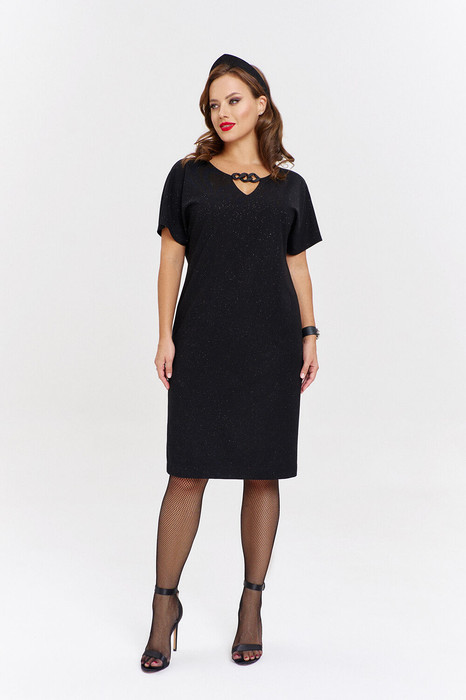 Платье из пластичного трикотажа с легким мерцанием, полуприлегающего силуэта с рукавом кимоно. Спинка со средним швом. Оригинальный вырез платья декорирован эффектной пластиковой цепью "софт-тач". Изделие на подкладке.