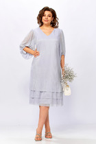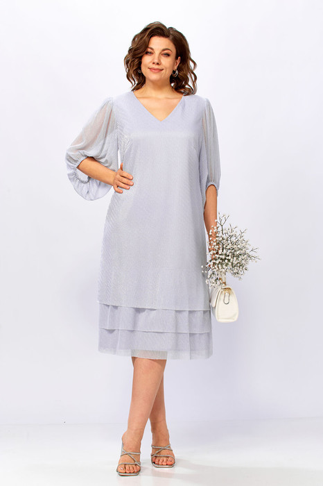 Платье женское, нарядное из тонкого плиссированного трикотажного полотна с лёгкой люрексовой ниткой. Полуприлегающего силуэта, свободное, слегка расширенное к низу, с V-образным вырезом горловины, рукав широкий со сборкой по верхней и нижней части, по низу изделия воланы. Платье на подкладке.