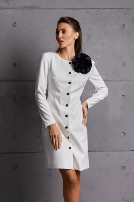 Платье женское из однотонной ткани, прилегающего силуэта, вырез горловины полукруглый, рукав втачной со сборкой по верхней части, застежа спереди на пуговицы, по переду и спинке изделия вытачки, спереди отделочная деталь-декоративный цветок из ткани, съемный, платье на подкладке.