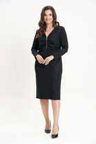 Женское нарядное платье выполнено из плательно-костюмной однотонной ткани с блестящим  напылением. Перед со средним швом, заканчивающимся разрезом.Спинка цельная.Рукава цельнокроеные с широкими двойными манжетами, длиной 3/4.Вырез горловины по переду круглый ,а по спинке  V-образный с планкой и декоративной пластинкой, обработан обтачками.