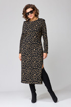 Женское платье из плотной хорошо тянущеся трикотажной ткани. Платье прилегающего силуэта, отрезное по линии талии. По полочке талиевые вытачки, переходящие в рельефы на юбке платья, в одном из рельефов по низу разрез. Горловина квадратной формы. Рукав втачной, со складками по окату. Спинка со средним швом.