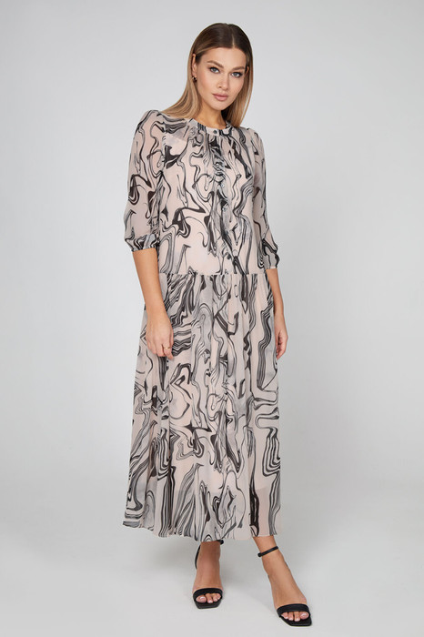 Современное и женственное! Это струящееся свободное платье длины макси из польского шифона с щедро расклешенной юбкой обладает очаровательной легкостью. Вместе с интересным абстрактным принтом оно придает особый дух, подчеркивающий Вашу индивидуальность. Модель, с центральной застёжкой на петли и пуговицы, декоративной планкой по горловине со сборкой по переду и укороченными полупрозрачными рукавами, сосбореными по низу эластичной тесьмой и дополненные небольшой сборкой по окату, имеет подкладку из вискозы, благодаря которой Вы будете чувствовать себя комфортно. Идеально подходит для модных образов!
