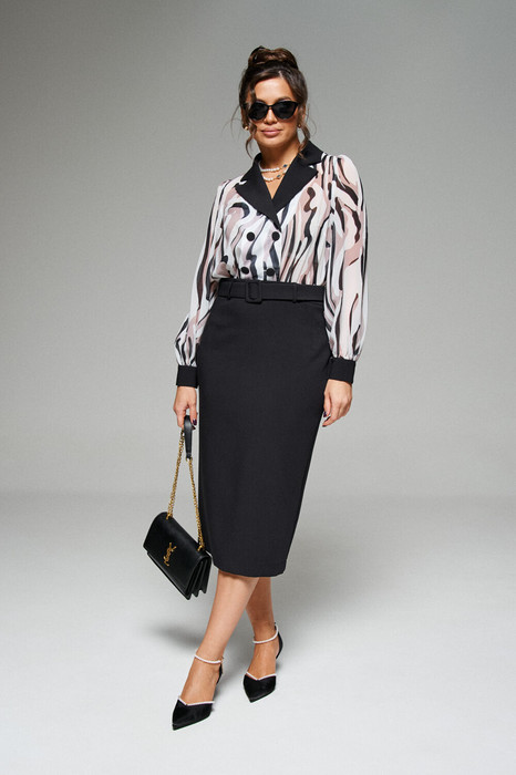 Лиф платья имитирует блузку на застежке, заправленную в юбку. Юбка платья имеет прямую, зауженную к низу форму «карандаш» длиной миди, что эффектно подчеркивает женственность фигуры.