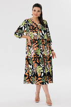 В боковых швах выполнены функциональные карманы. В комплекте к платью идёт пояс в цвет принта.