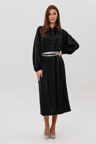 Рукав втачной, с манжетой. На передней части нагрудные вытачки. Акцентные, контрастного цвета воротник, манжеты и декоративные пришивные клапаны освежают образ. Планка и клапаны декорированы пуговицами. Низ платья обработан на плоскошовной машине.