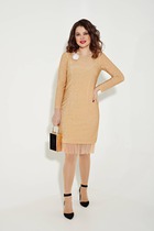 Платье женское нарядное А-силуэта выполнено из блестящей ткани на трикотажной основе, застежка- молния по среднему шву спинки, фигурный рукав с манжетом на пуговице. Длина платья по спинке 101 см, длина рукава 56 см