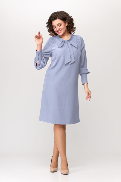 Элегантное женское платье из однотонной плательной ткани. Платье «А» образного силуэта с круглой горловиной оформленной стойкой, украшением служит съемный бант. Платье с фигурной проймой, рукав расширенный, со стойкой по окату и низу. Низ рукава оформлен широким манжетом с декоративными пуговицами. Платье без подкладки.