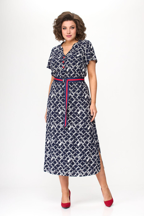 Платье полуприлегающего силуэта, отрезное по линии талии. По переду фигурный вырез с планкой, на планке пришиты контрастные пуговицы. Юбка немного расширена к низу, по боковым швам разрезы, на уровне бедер в боковых швах карманы. Рукава втачные, короткие, расширенные к низу.