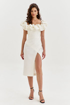 Платье шифоновое А-силуэта. Втачной длинный рукав со сборкой по окату и внизу на завязке. Полочка и спинка с притачными слегка присборенным воланом с рюшей.  Воротник стойка-рюша и вырезом каплей по переду на завязке. Платье на подкладке.