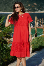 Платье женское А-силуэта. Воротник отложной, вырез V-образный, застежка смещенная однобортная на кнопки. Рукав втачной с спущенной линией плеча, по низу манжет. В боковых швах функциональные карманы. Изделие дополнено съемным поясом из основной ткани.