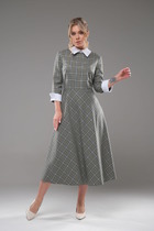 Платье женское, полуприлегающего силуэта, по спинке средний шов, заканчивающийся внизу разрезом. Пройма квадратная, рукав втачно одношовный, зауженный к низу. Воротник- цельнокроенная стойка с расширенной горловиной. В качестве отделки используется фурнитура и съемный пояс.