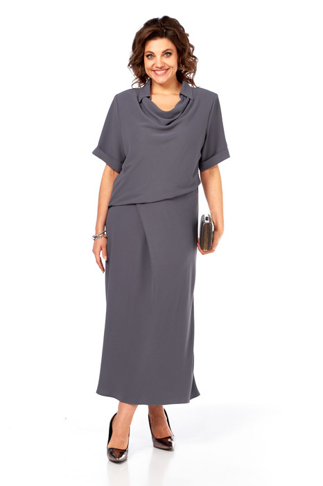 Платье женское длиной до середины икры, слегка расклешенное к низу. Спинка с косым передом в области талии и средним швом до разреза. Перед с косым подрезом в области талии, образующий мягкую складку из лифа и 1 глубокую складку от подреза вниз. Горловина с рубашечным воротником на стойке и драпировкой в виде качели. Рукав втачной с отложными манжетами.