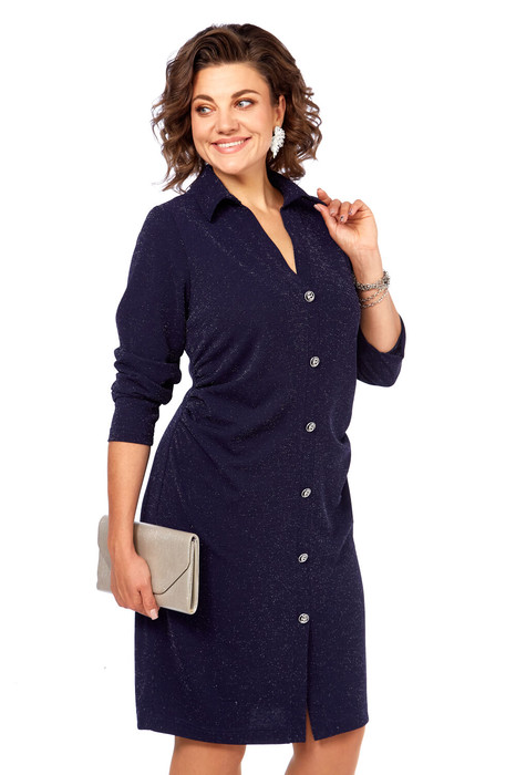 Платье женское полуприлегающего силуэта выполнено из трикотажного полотна с блеском. Спинка с талиевыми вытачками. Перед с имитьацией застежки на планке и 6-ю пуговицами. В области талии у боковых швов сборка. Воротник рубашечный на притачной стойке. рукав втачной одношовный. Фурнитура может отличаться от заявленной на фото.