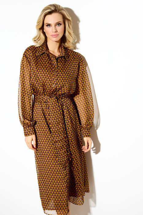 Платье женское полуприлегающего силуэта из плательной ткани на подкладке. Рукава длинные, втачные  по низу рукава обработана притачная манжета. Воротник-стойка. Центральная застежка на приточных планках, застегивающихся на петли и пуговицы. Платье дополнено декоративным ремнем.