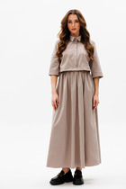 Платье женское прямого силуэта, имеется пояс-завязка из основной ткани. В боковых швах выполнены боковые карманы. Воротник отложной на стойке. Рукав короткий, спущенный, цельнокроенный с притачной отложной манжетой. Застежка в платье на цельнокроенных планках через пробивные кнопки. Низ изделия обработан широкой подгибкой со швом с закрытым срезом.