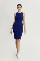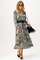 Платье женское приталенного силуэта со сьемным поясом из основной ткани. По спинке кокетка. Воротник - стойка. По переду притачные планки. В боковых швах разрезы до середины бедра. Застежка на пробивные петли и притачные пуговицы.