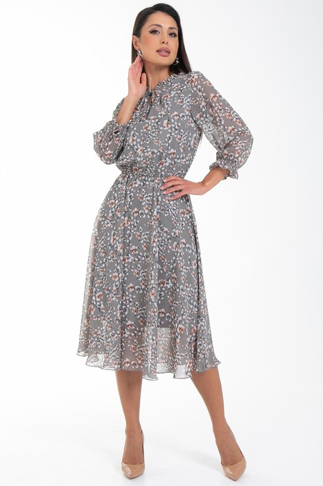 Летящее шифоновое платье подчёркивает достоинства вашей фигуры, делает Ваш образ женственным и нежным. Юбка платья полусолнце отрезная по линии талии. Полупрозрачные втачные рукава длиной 3/4 с низу подогнуты и сосборены на резинку. Платье с подкладом,притачным по горловине и пройме.По талии платье присборено на шпульную резину. Модель выполнена из шифона и трикотажного подклада.