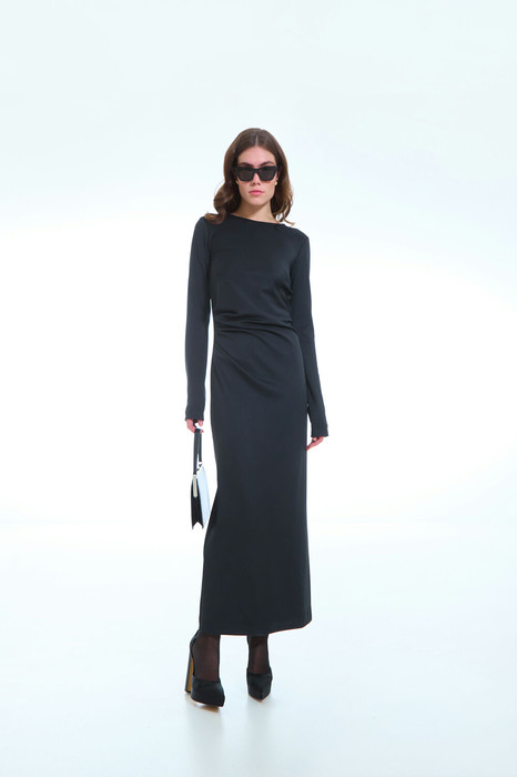 Это изысканное женское трикотажное платье, выполненное в полуприлегающем силуете, подчеркивающем женственные формы и создающем элегантный образ. Стильный боковой разрез добавляет наряду легкости и динамики, а передняя часть украшена аккуратными вытачками и мягкими складками, исходящими из правого бокового шва, что придает модели особую изысканность и выразительность.