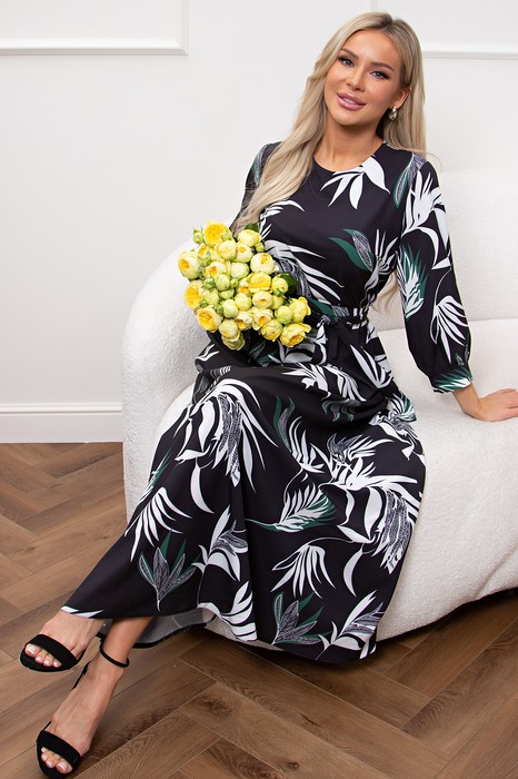 Красивое платье приталенного силуэта. Округлая горловина на внутренней обтачке, по спинке разрез - капелька с застежкой на петлю и пуговицу. Втачной рукав 3/4, оканчивается притачной манжетой. Модель отрезная по линии талии. По талии проложена эластичная резинка, что дополнительно подчеркнет Ваш силуэт. Пояс - кушак из основного материала в комплекте.