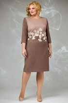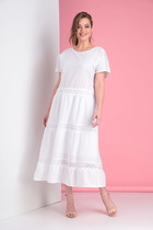 Платье выполнено из льна. Платье отрезное по линии талии, длиной выше линии колен. Лиф двойной: нижний покрывает туловище, верхний - покроя "летучая мышь". Задняя часть юбки на кокетке, центральная часть которой собрана на венгерку. Пояс вставлен в боковые швы с бантом по переду.