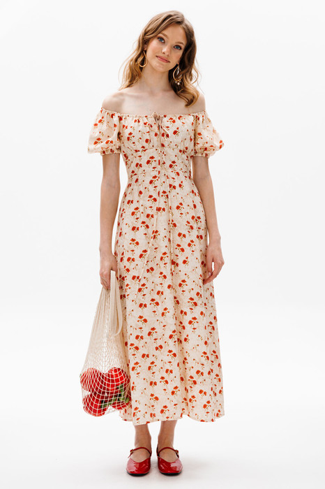 Платье выполнено из плательной ткани с цветочным принтом. Платье А-образного силуэта, длиной миди. Горловина спереди и на спинке горизонтальной формы. Нижняя часть переда выполнена в виде широкого втачного пояса. Спереди средний шов, в нем прорезь с кулисой для шнурка. Рукав покроя полуреглан со сборкой и эластичной тесьмой по окату. Низ рукава расширен, присборен и обработан эластичной тесьмой. Юбка расширена к низу. В левом боковом шве застежка на потайную молнию. Платье на отлетной по низу подкладке.