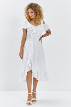 Платье женское выполнено из тонкого хлопка с вышевкой. Изделие выполнено в романтичном стиле со множеством оборок и воланов. Изделие отрезное по линии талии. Лиф асимметричной формы, по лифу расположены воланы. Юбка расклешенная с широким воланом по низу. Застежка - потайная молния.