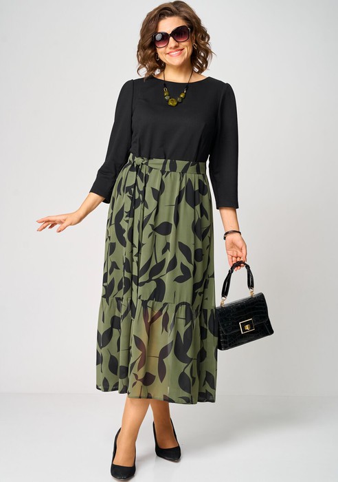 Платье женское нарядно-повседневное полуприлегающего силэта до талии. Выполненео из трикотажного полотна в сочетании с шифоном. Вырез горловины круглый на обтачке. По спинке застежка капелька на навесную петлю и пуговицу. Рукав втачной 7/8 по верху со встречной складкой. Платье отрезное по талии, верх из трикотажного полотна , низ платья юбка со сборкой. декором платья служит съемный пояс в цвет юбки.
