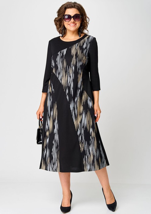 Платье женсоке повседневное полуприлегающего силуэта расширенное к низу, выполнено из трикотажного полотна двух дизайнов. Вырез горловины круглый на обтачке. Рукав втачной 3/4. Спинка платья выполнена из однотона, полочка с отделочными вставками из цветного трикотажа. В одном боковом шве обраборан разрез. Декором платья служат вставки из отделочного трикотажа.