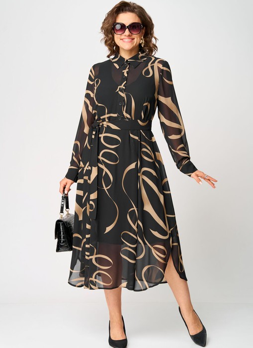Платье женско нарядно-поседневное полуприлегающего силуэта до таии расширенное к низу. Платье отрезное по талии, выполнено из креп-шифона, врез горловины воротник на стойке рубашечного типа, рукав втачной по низу на притачной манжете. Низ платья фигурный, в боковых швах обработаны разрезы. По юбке платья от талии трикотажная подкладка. Декором платья служит съемный пояс и принт самой ткани.