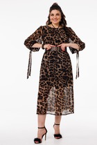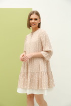 Платье женское нарядно-повседневное полуприлегающего силуэта расширенное к низу. Выполнено из хлопка. .Вырез горловины фигурный, воротник на стойке с фигурным вырезом. Рукав спущенный из отделочной ткани по низу с воланом собранным на сборку. Платье отрезное по лиии талии. Юбка ассиметричная с застежкой доверху на обметанные петли и пуговицы в боковых вах обработаны карманы. По низу юбки притачной волан из основной ткани. Декором платья служит дизайн ткани, съемный пояс из основной ткани и отделочные пуговицы.