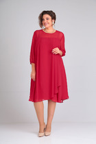 Платье с V-образным вырезом горловины, отрезное чуть выше линии талии, с коротким рукавом покроя-реглан имеет конструктивное решение в виде широких воланов с легкими сборками.