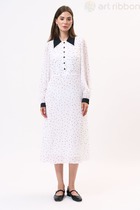 В области груди-сборки вместо нагрудных выточек. По центру спинки также сборки с декоративной подвески у планки горловины. Горловина и низ рукавов обработаны полосами широкого полупрозрачного хлопкового кружева, окрашенного в тон основного цвета платья.