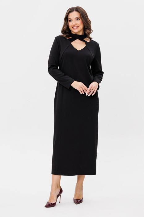 Таинственность великолепного чёрного платья не останется не замеченной. Она элегантно и лаконично, однако оригинальное исполнение выреза горловины со сложным геометрическим решением, делает образ очень эффектным. Полуприлегающий силуэт, втачной покрой. Полочка с рельефом, переходящим в вырез горловины. Спинка с центральным швом, разрезом и молнией, цельнокроённой стойкой и талиевой вытачкой.