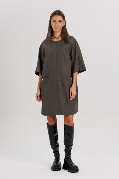 Платье имеет декоративные металлические элементы у линии карманов, что придает образу современный акцент. Универсальная длина до колена позволяет сочетать модель как с высокими сапогами, так и с ботильонами или обувью на плоской подошве.