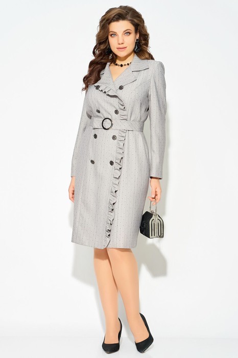 Платье полуприлегающего силуэта, застежка - двубортная. По краю борта пришита декоративная рюша, воротник отложной пиджачно-рубашечного типа. Платье можно застегивать доверху или в виде жакета. Рукава двухшовные втачные, низ рукава обработан швом в подгибку с открытым срезом. Застежку платья украшает десять пуговиц, что придает нарядности, повседневности, элегантности и уверенности. По полочке - рельефы, по спинке - отрезная кокетка, средний шок и выточки. Низ платья обработан швом в подгибку с открытым срезом.