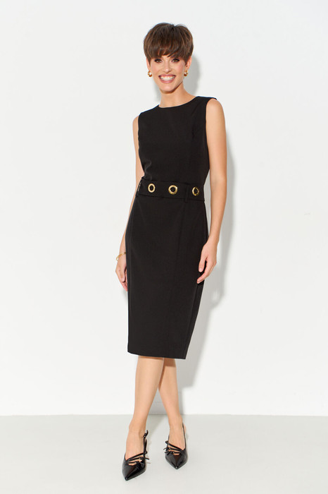 Классическое платье-чехол без рукавов на трикотажной тянущейся покладке выполнено из плательной ткани. По переду и спинке вертикальные рельефы выходят из пройм; по спинке - застежка на молнию; по низу - шлица. В комплекте предусмотрен съёмный пояс с люверсами, который легко вставляется в аккуратно настроченные шлёвки по линии талии, добавляя образу стильный акцент.  Платье полностью соответсвует заявленному размеру. Пожалуйста, пользуйтесь таблицей обмеров готового изделия.