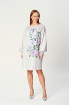 Платье А-образного силуэта выполнено из вискозной ткани с летним принтом. Платье с рубашечным воротником и центральной застежкой на петли и пуговиц. Перед с нагрудной вытачкой. Рукав втачной одношовный с притачной манжетой на петлю и пуговицу. По линии притачивания - сборка. По низу платья притачан волан со сборкой. К платью прилагается съемный пояс из основной ткани. Длина платья по спинке- 127 см, длина рукава- 29 см.