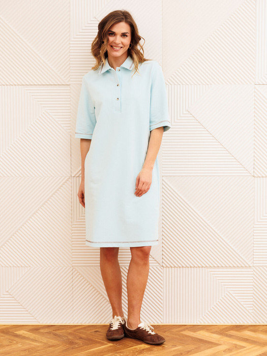 Платье прямого силуэта с воротником поло. Рукав втачной одношовный. По низу изделия, по низу рукава и по воротнику проложена отделочная строчка. Длина платья - 97 см, длина рукава - 30 см