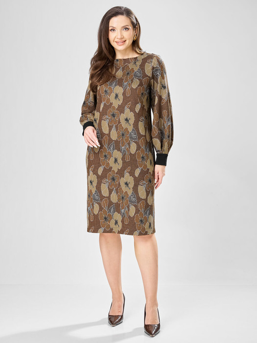 Платье прямого силуэта из плотного трикотажного полотна с рисунком и с люрексом. Перед с нагрудными вытачками. Спинка со средним швом. Горловина лодочкой обработана планкой. Рукав одношовный втачной по низу со складками собранными на манжету. Длина платья-100см, длина рукава-60см.