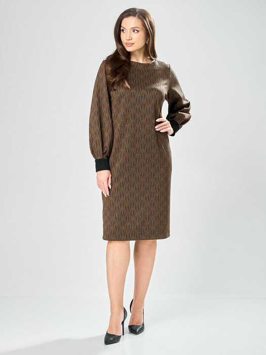Платье прямого силуэта из плотного трикотажного полотна с рисунком. Перед с нагрудными вытачками. Спинка со средним швом. Горловина лодочкой обработана планкой. Рукав одношовный втачной по низу со складками собранными на манжету. В боковом шве карман.  Длина платья-100см, длина рукава-60см.