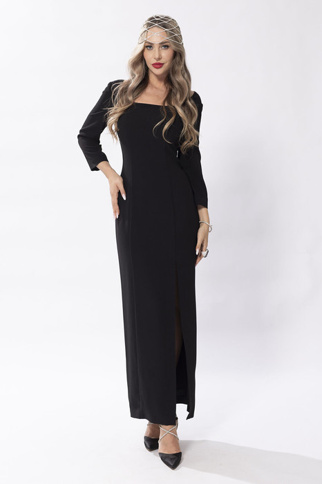 Платье полуприлегающего силуэта, с застежкой на потайную молнию в среднем шве спинки, без воротника, с квадратным вырезом горловины по переду и V-образным вырезом горловины по спинке. По переду с рельефами, выходящими из горловины. Левый рельефный шов заканчивается разрезом. Спинка со средним швом, талиевыми вытачками. Рукав втачной, 3/4
