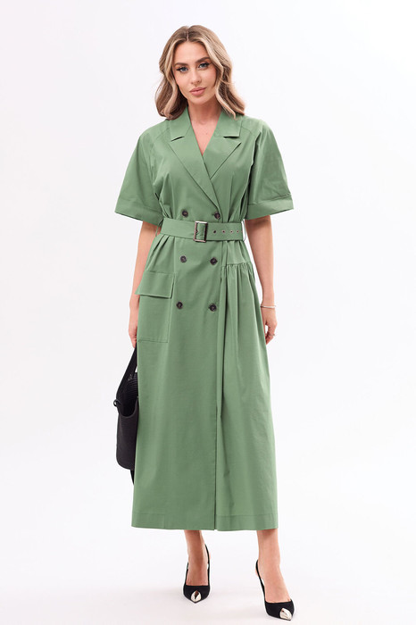Платье с центральной двубортной застежкой, втачным воротником и отложными лацканами. Платье подрезом по спинке и правой полочке. По шву подреза нижняя часть платья присборена. По правой полочке- на уровне бедер расположен накладной карман с клапаном. Верхняя часть спинки с отлетной кокеткой. Рукав реглан, короткий. Платье со съемным поясом.