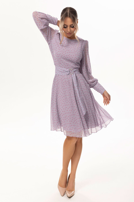 Платье без воротника, с круглым вырезом горловины, застежкой на потайную молнию в среднем шве спинки. Платье отрезное по линии талии. Верхняя часть переда с талиевыми вытачками. Спинка со средним швом, верхняя часть спинки с талиевыми вытачками. Окат рукава присборен. Платье со съемным поясом.