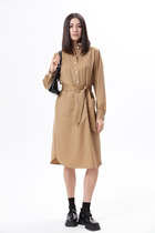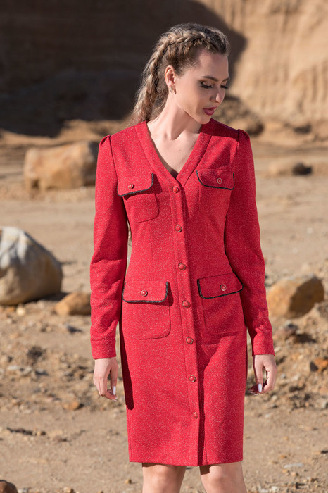 Платье полуприлегающего силуэта, без воротника, с фигурным вырезом горловины, центральной застежкой на петли и пуговицы. По переду накладные карманы с клапанами на уровне груди и на уровне бедер. Клапаны с контрастными кантами. Перед с полурельефами, выходящими из проймы. Спинка со средним швом, полурельефами, выходящими из проймы.