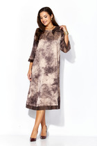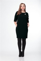 Платье, с застежкой на потайную молнию по среднему шву спинки, без воротника, с фигурным вырезом горловины. Платье отрезное по линии талии. Нижняя часть платья состоит из двух воланов. Лиф переда с рельефами, выходящими из горловины. Лиф спинки со средним швом, рельефами, выходящими из горловины. Рукав втачной, длинный, с отрезной манжетой. Окат и шов притачивания манжеты присборен. Платье со съемным поясом.