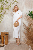 Платье с центральной застежкой на петли и пуговицы, без воротника, с круглым вырезом горловины. По боковым швам- разрезы. Плечевые швы переходящие на перед. По плечевым швам расположены паты, закрепленные петлей и пуговицей. Платье со съемным поясом, закрепленным шлевками по боковым швам. Рукав втачной, длинный, с отрезной манжетой.