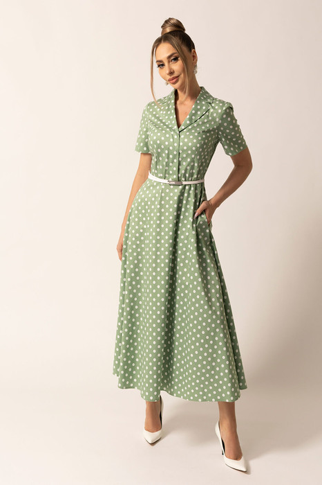 Платье с отложным воротником и лацканами, центральной потайной застежкой на петли и пуговицы по верхней части платья и потайную молнию в левом боковом шве. Платье отрезное по линии талии. Верхняя часть переда платья с нагрудными и талиевыми вытачками. Спинка со средним швом и талиевыми вытачками. В боковых швах расположены карманы.